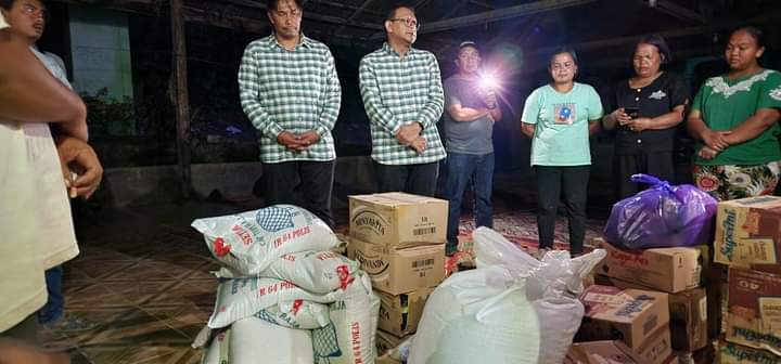 Tino dan Onasis menyerahkan bantuan berupa selimut, sirih, ikan, mintak goreng, beras, dan sembako lainnya.