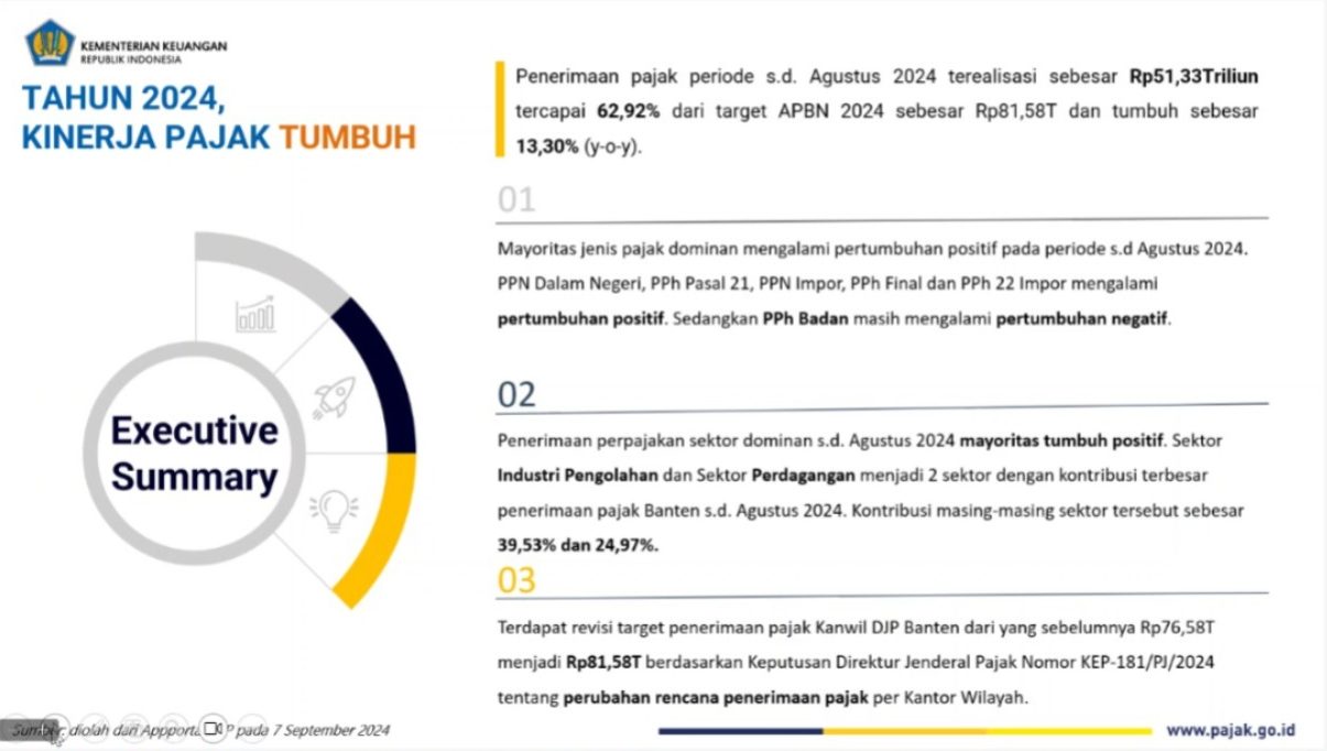 Kinerja Penerimaan Pajak Selanjutnya, Cucu Supriatna, Kepala Kanwil DJP Banten, menyampaikan informasi tentang penerimaan pajak Provinsi Banten hingga 31 Agustus 2024. Menurutnya, penerimaan pajak periode tersebut tercapai sebesar Rp51,33 triliun, memenuhi 62,92% dari target APBN 2024 sebesar Rp81,58 triliun dan tumbuh sebesar 13,30% (yoy) dan kinerja penerimaan  pajak tumbuh dengan baik.